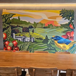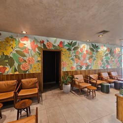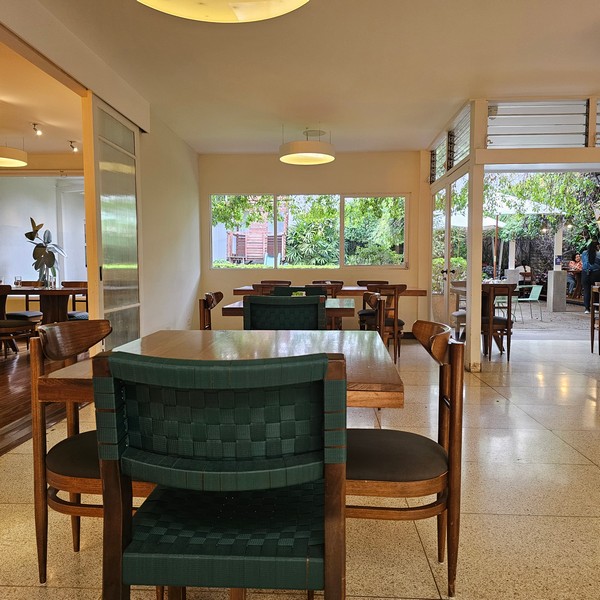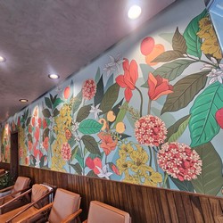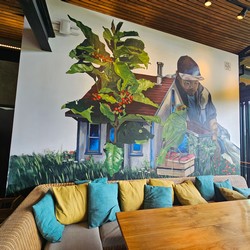 This stores includes many murals, including one depicting Hacienda Alsacia, as well as upstairs balcony seating.