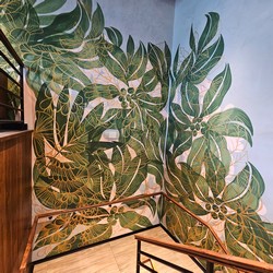 This store has many unique features a new and possibly unique design including a ceiling artwork, a funky coffee table, and a gorgeous Siren mural.