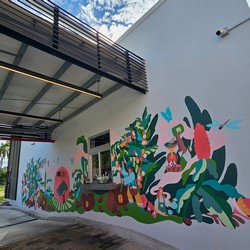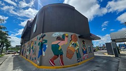 This store features a colourful mural that wraps around the entirety of the drive-thru lane.