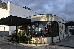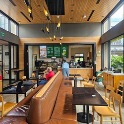 This store features a drive-thru mural of Hacienda Alsascia and also includes real plans from the coffee far. Also, it sits at the edge of a cool food truck plaza. No washroom unfortunately.