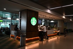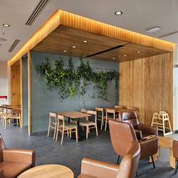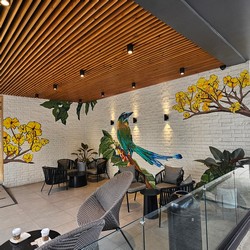 Although relatively simple by local standards, this store still includes a mural running up the stairs, and baclony seating.