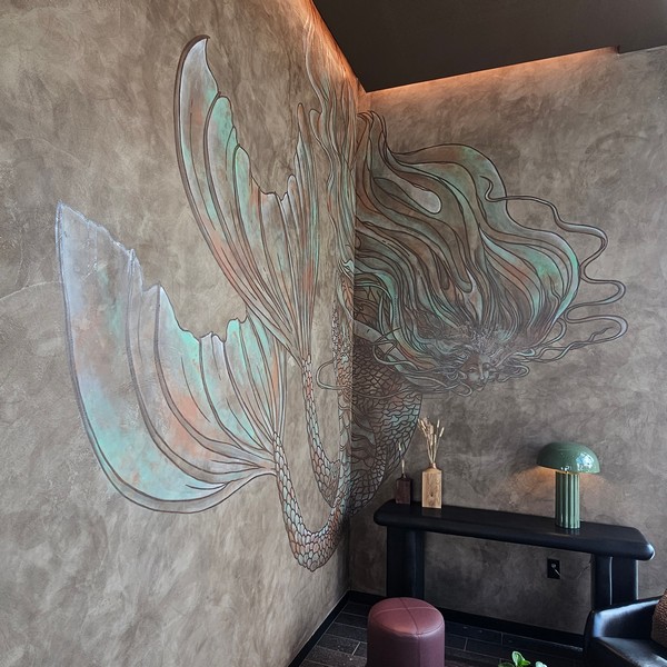 This store has many unique features a new and possibly unique design including a ceiling artwork, a funky coffee table, and a gorgeous Siren mural.