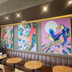 Although relatively simple by local standards, this store still includes a mural running up the stairs, and baclony seating.