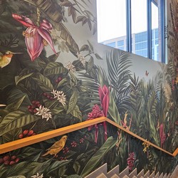 This store includes a mural running up the stairs, and also an upstairs balcony.